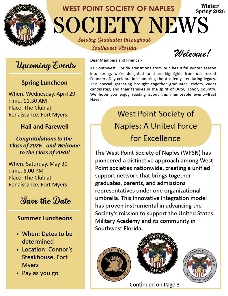 Welcome to the website for the West Point Society of Naples (WPSN). We are based in Naples, but our membership area covers all of Collier, Lee, Charlotte, Glade, Hendry, Manatee, and Sarasota Counties.